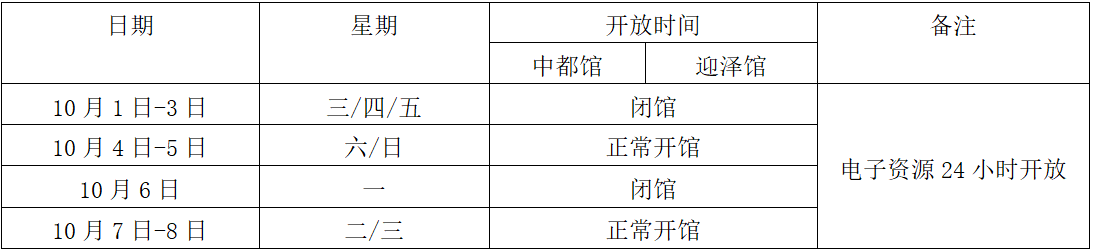 根据学校《关于2025年国庆、中秋节放假安排的通知》文件精神,结合图书馆具体工作情况,2025年国庆、中秋节假期图书馆开放时间如下: